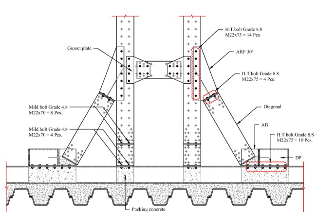 An assembly drawing of a bolt joint system illustrates how multiple components are connected using bolts, washers, and nuts. It typically includes: