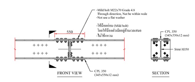 An assembly drawing of a bolt joint system illustrates how multiple components are connected using bolts, washers, and nuts. It typically includes: